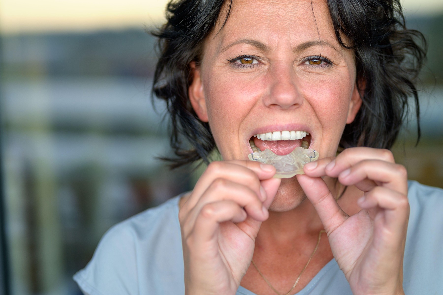 Ženska z bruksizmom, ki drži nočno opornico za zaščito zob pred škrtanjem med spanjem – pogled od spredaj v bližnjem posnetku.