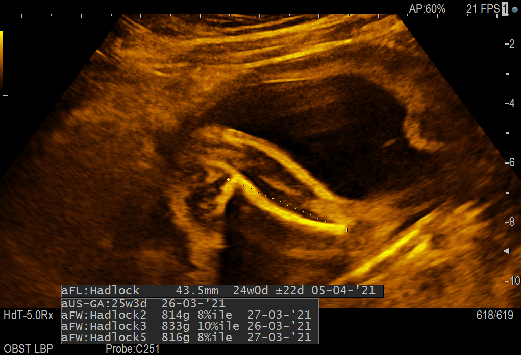 Sem v 26t4d in nosim fantka. Ginekologinja je opravila osnovno morfologijo. Plod je bil postavljen na glavo in je imel tako roke, kot noge ob glavici. Opazila ja, da je stegnenica (FL) krajša in skupaj z ostalimi meritvami naj bi komaj ujeli spodnjo normalo. Stegnenica po meritvah odstopa za 18 dni. Prilagam vam tako sliko vseh meritev, kot sliko stegnenice. Glede na to, da so do sedaj meritve UZ nakazovale na to, da razvoj ploda ustreza njegovi gestacijski starosti (oz. jo celo rahlo »prehiteva«) me zanima, ali bi me moralo sedaj to nezanemarljivo odstopanje skrbeti. Za občutek podam še osnovne meritve morfologije opravljene v 20t4d (BPD-53; HC-192; AC-151; FL-32; teža=352 g). Ponovljena morfologija v 24t naj bi bila ok (meritev ginekologinja ni zapisala).