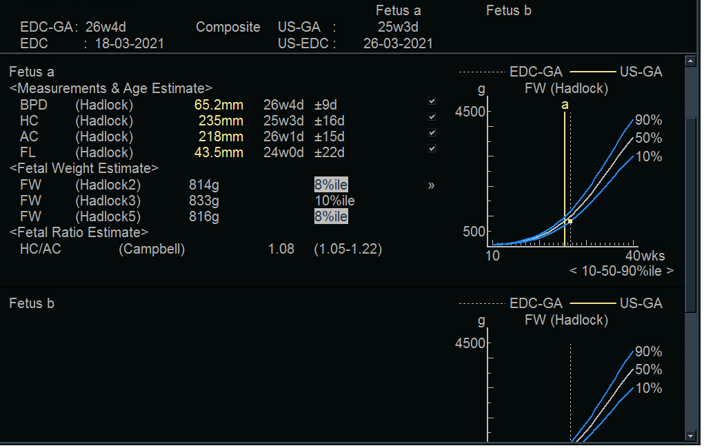 Danes sem noseča 35t+5d. Pred dvema tednoma, ko sem bila noseča 33t+4d sem bila prvič na oceni rasti ploda v ljubljanski porodnišnici. Takrat so mere odstopale vendar je ginekologinja povedala, da je še vseeno v nekih mejah normale. Včeraj sem bila zopet na kontroli in je bila videti nekoliko bolj zaskrbljena ni pa povedala nič konkretnega razen to, da moram počivati. Ko sem prišla domov in pogledala mere sem videla, da sicer raste po neki svoji krivulji, tudi zredil se je za 300g, vendar me je močno zmotil BPD (je pa rekla, da ga je težko izmerit ker je ravno v takšnem položaju). Pa še vseeno.