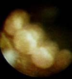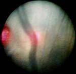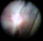 Sliki 5 in 6: Laserska koagulacija žilja na posteljici, kot jo vidimo skozi endoskop: zgoraj pred koagulacijo, spodaj med koagulacijo.