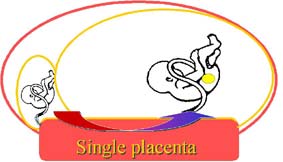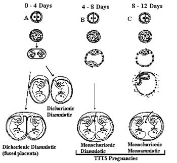 Slika 1. Prikazuje nastanek enojajčnih dvojčkov različnih stopenj glede na čas, ko se razdelita in glede na posteljico in amnijske ovoje. Če se razdelita do 4. dneva po oploditvi nastane dvoplodna nosečnost, ki je zelo podobna dvojajčni nosečnosti – vsak ima lastno posteljico in lastno amnijsko votlino. Med 4. in 8. dnem delitev dvojčkov pripelje do monohorionske dvoplodne nosečnosti s kupno posteljico in lastno amnijsko votlino vsakega od dvojčkov, med 8. in 12. dnem nastanejo mono-amniotski dvojčki, po 12. dnevu cepitve pa zraščeni (siamski) dvojčki.