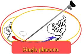 Slika 2 kaže normalno stanje, kjer se kri razporedi med oba dvojčka enakomerno, slika 3 pa ilustrira začetek sindroma transfuzije od dvojčka k dvojčku, kjer kri teče pretežno od enega dvojčka “dajalca” k drugemu, “prejemniku”.