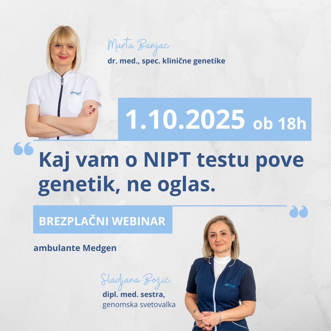 Na trgu je veliko ponudnikov in komercialnih imen testov, bodoči starši tako pogosto ostajajo zmedeni. Da bi dobili odgovore iz strokovnega vira prisluhnite brezplačnem webinarju, kjer bo o NIPT testu spregovorila Marta Banjac, dr. med., spec. klinične genetike iz ambulante Medgen.