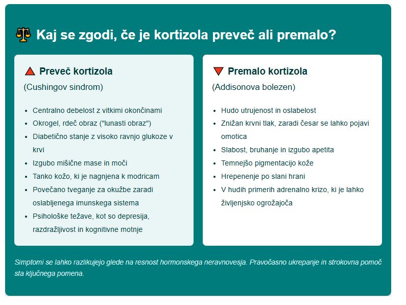 - Premalo kortizola je pogosto posledica motenj v delovanju nadledvičnih žlez ali hipofize. To lahko vodi v Addisonovo bolezen, ki se kaže z utrujenostjo, nizkim krvnim tlakom, izgubo telesne mase in temnejšo pigmentacijo kože.