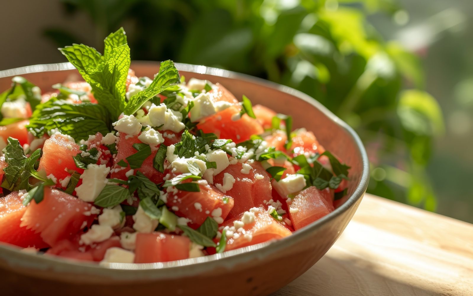 Barvita poletna solata z lubenico, feto sirom in svežo meto. Hitra, osvežilna in idealna izbira kot priloga k jedem z žara na poletnem pikniku.
