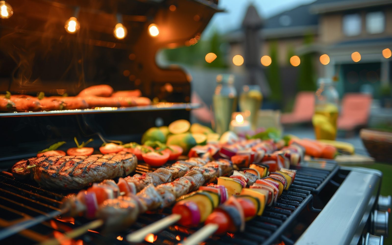 Nasveti za popoln poletni piknik na vrtu - pogled na žar z zrezki, nabodali, pečeno zelenjavo in prilogami.
