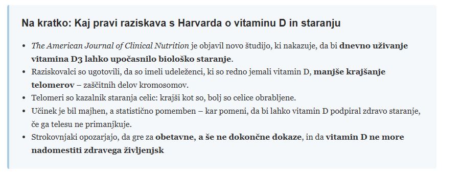 Znanstveniki opozarjajo, da gre za obetavne, a še ne dokončne dokaze. Čeprav so bile razlike med skupinami statistično značilne, so še vedno znotraj običajnega biološkega razpona. To pomeni, da vitamin D sam po sebi ne preprečuje staranja, lahko pa prispeva k ohranjanju nekaterih bioloških funkcij, če ga telesu ne primanjkuje. Temelj dolgotrajnega zdravja pa še vedno ostaja v osnovah: uravnoteženi prehrani, redni telesni dejavnosti, kakovostnem in zadostnem spancu ter učinkovitem obvladovanju stresa. Ti življenjski slog ne vpliva le na telomere, ampak celostno podpira zdravo staranje in kakovost življenja.